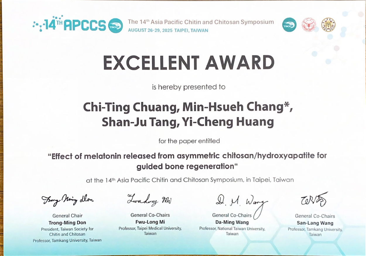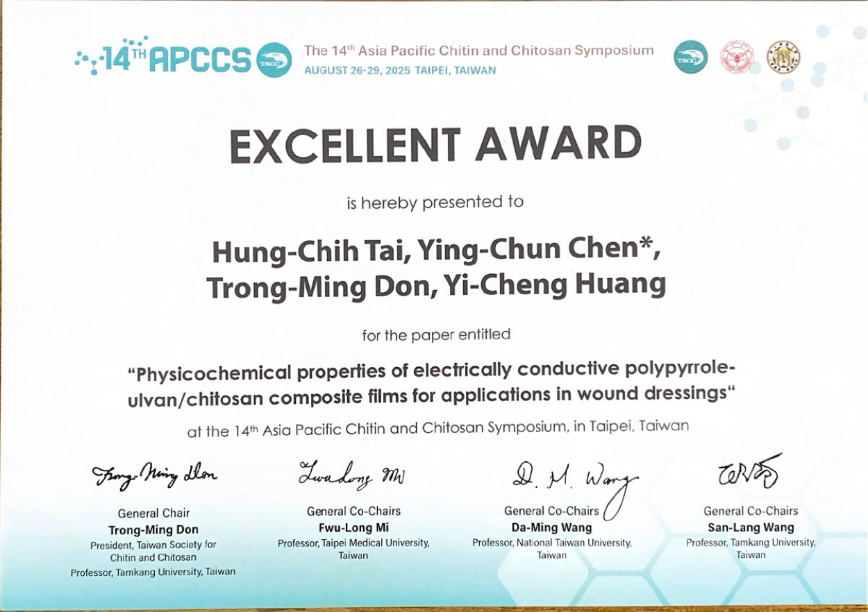 陳映君 常敏學 湯珊如(指導老師:黃意真教授)榮獲第十四屆亞太幾丁質幾丁聚醣會議 (APCCS 2025)壁報論文優等獎