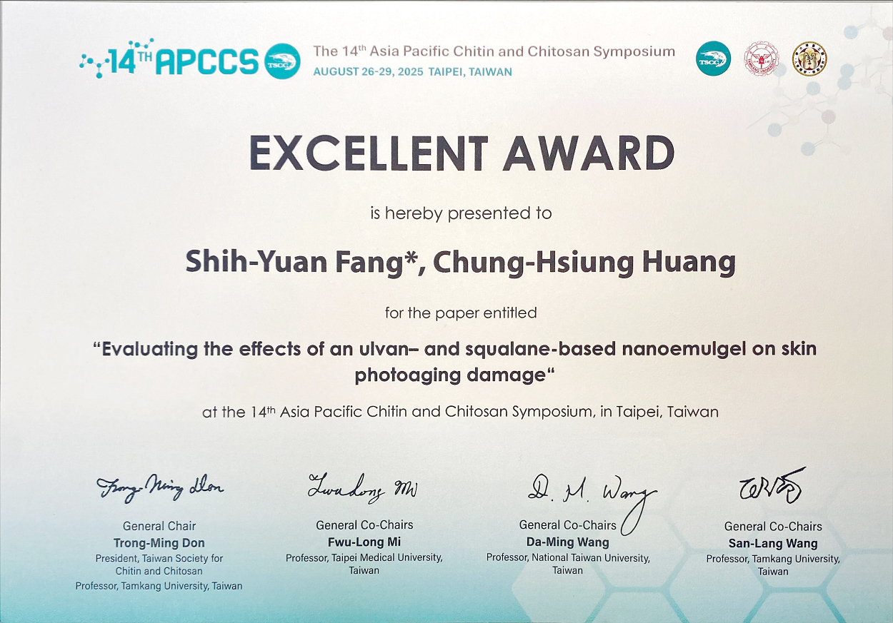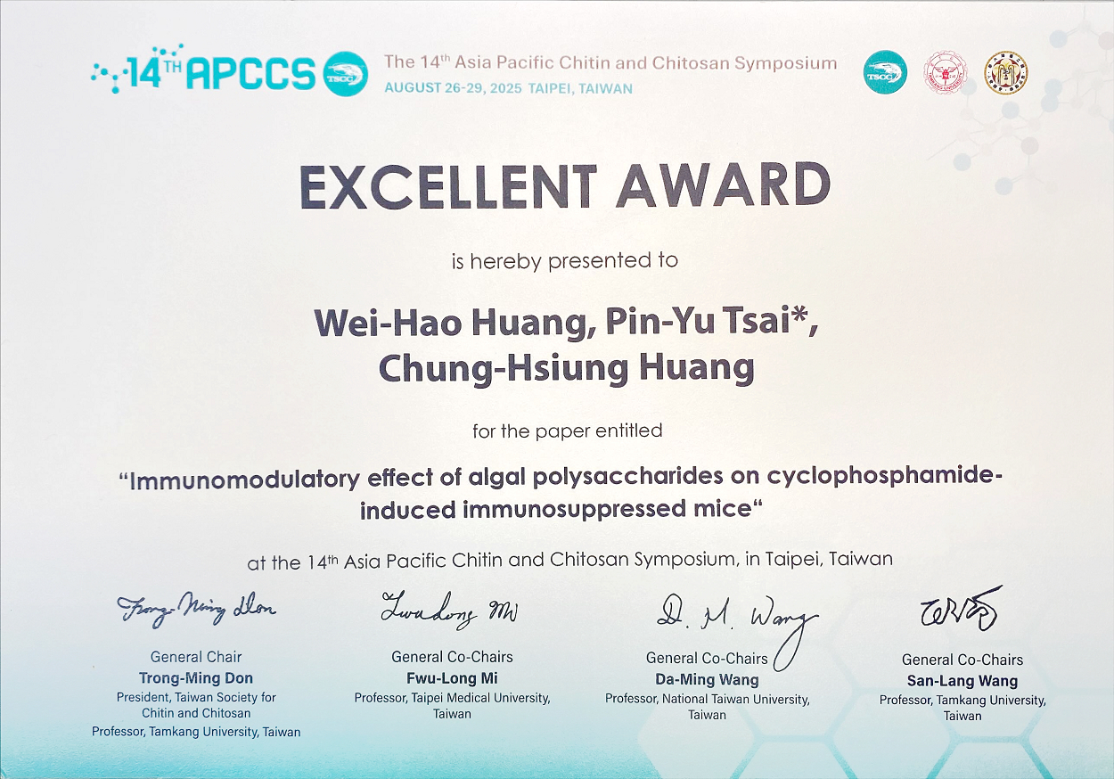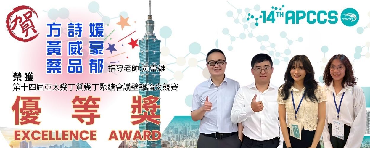 方詩媛 黃威豪 蔡品郁(指導老師:黃崇雄教授)榮獲第十四屆亞太幾丁質幾丁聚醣會議 (APCCS 2025)壁報論文優等獎