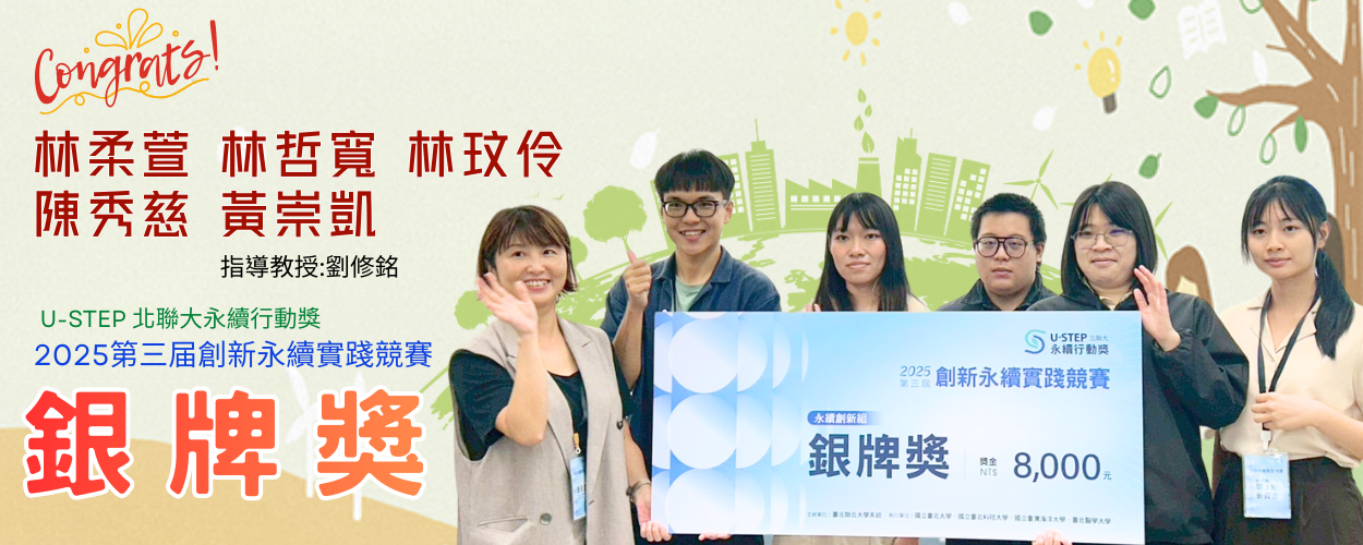 U-STEP 北聯大永續行動獎 2025第三届創新永續實踐競賽銀牌獎(永續創新組) 提案團隊:魚命食年 提案名稱:魚命食年一全魚利用永續發展 團隊成員:林柔萱、林哲寬、林玟伶、陳秀慈、黃崇凱 指導老師:劉修銘