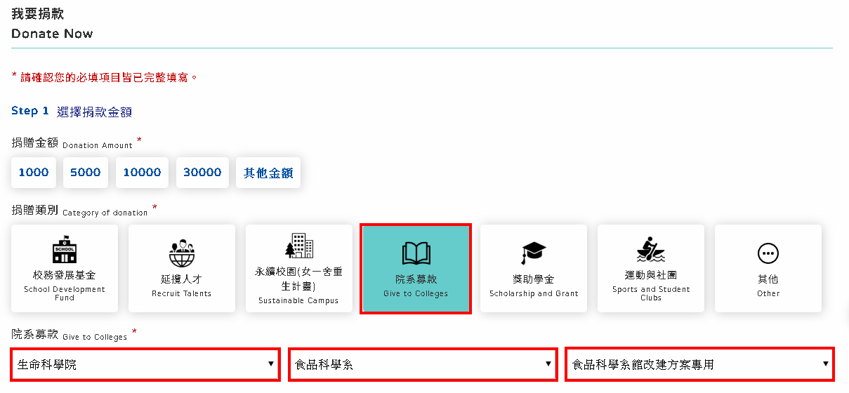 Step1 選擇捐贈金額 > 捐贈類別:院系募款>生命科學院>食品科學系>食品科學系館改建方案專用