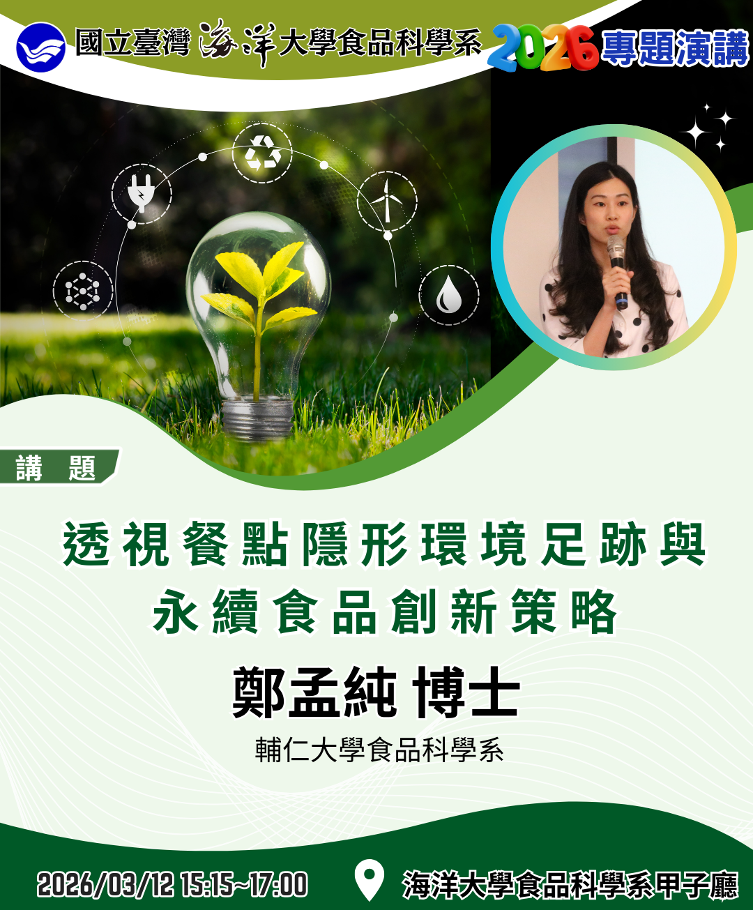 專題演講(2026-03-12):透視餐點隱形環境足跡與永續食品創新策略 ~ 鄭孟純 博士